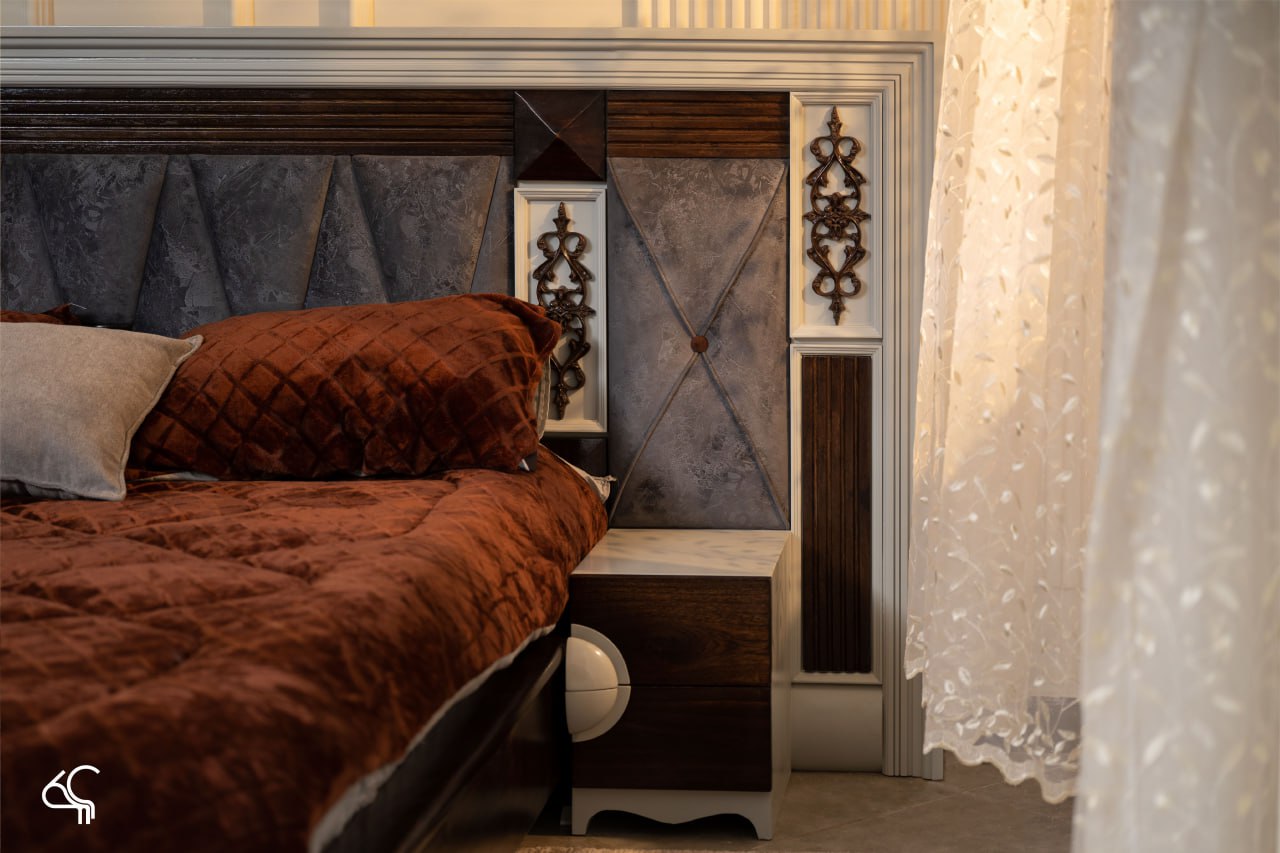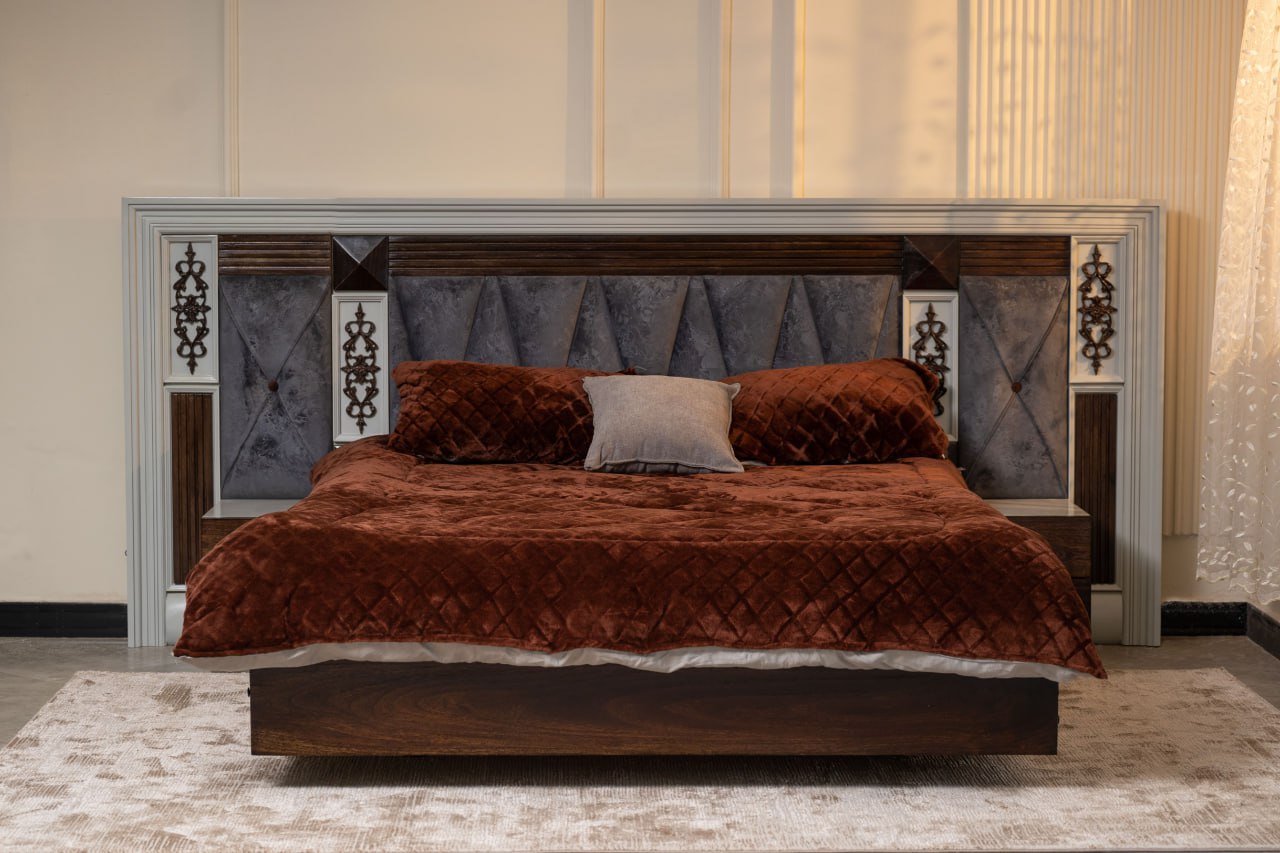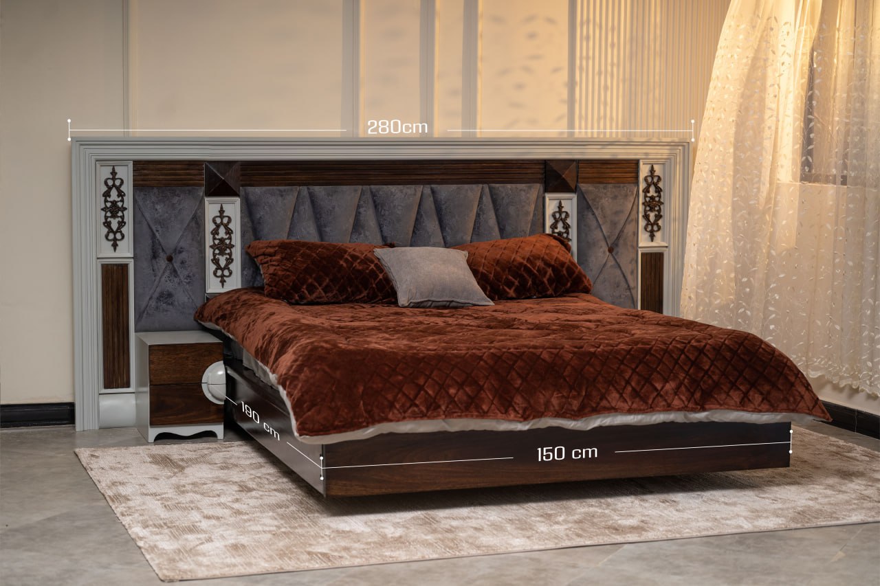 FANA bed combines bold presence with refined craftsmanship, designed to make the bedroom feel both luxurious and inviting. The wide 280 cm headboard features upholstered panels, geometric patterns, and elegant decorative accents that add depth and character. Rich wood textures balance beautifully with the soft fabric details, creating a warm and sophisticated look. With its spacious 150 × 190 cm sleeping area and integrated side tables, the design offers both comfort and practical elegance for modern living.