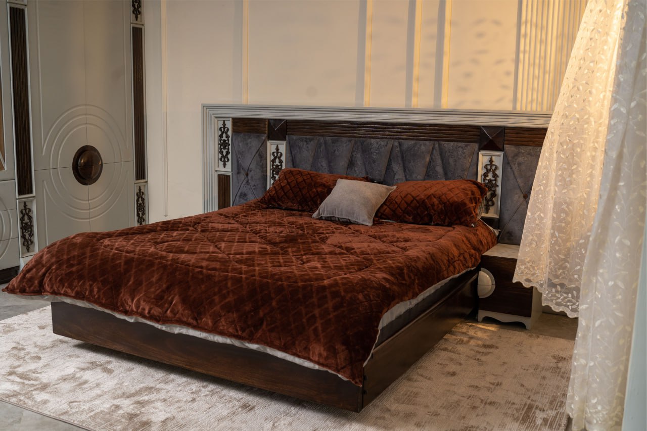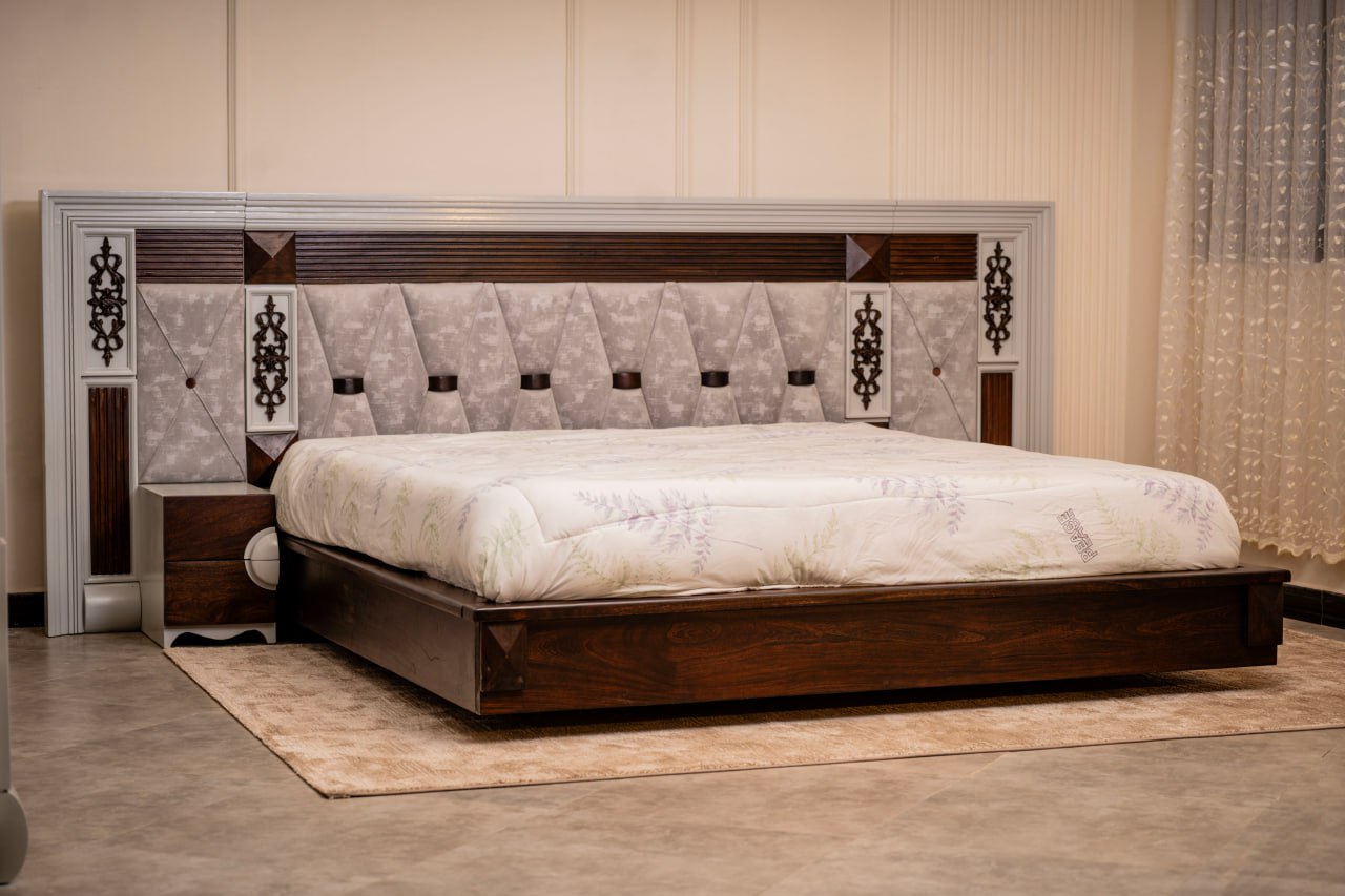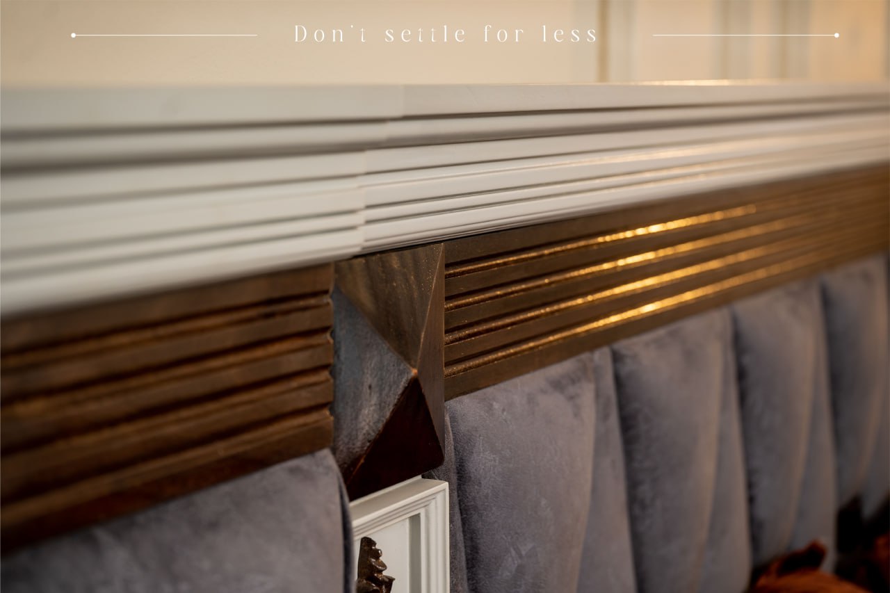 FANA bed combines bold presence with refined craftsmanship, designed to make the bedroom feel both luxurious and inviting. The wide 280 cm headboard features upholstered panels, geometric patterns, and elegant decorative accents that add depth and character. Rich wood textures balance beautifully with the soft fabric details, creating a warm and sophisticated look. With its spacious 150 × 190 cm sleeping area and integrated side tables, the design offers both comfort and practical elegance for modern living.